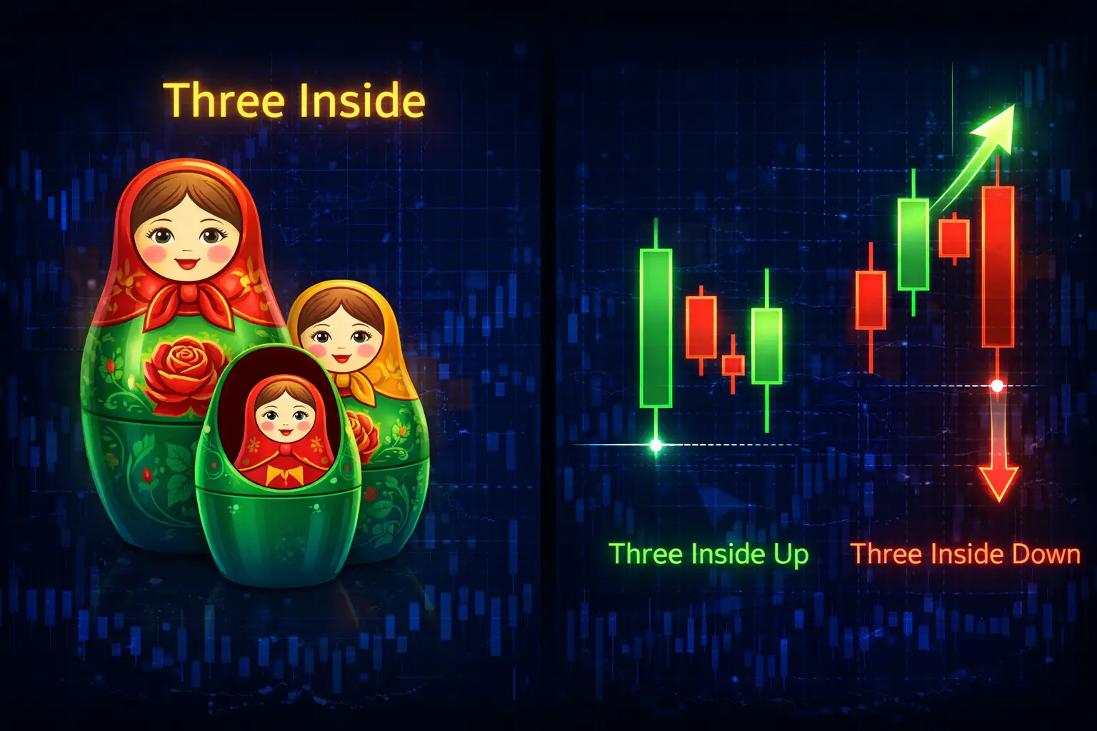 Бычья вариация паттерна называется «Три дня изнутри вверх» (англ. «Three inside up»). Эта модель предвещает смену нисходящей тенденции на восходящую. Ее появление на рынке означает, что пришло время покупать.